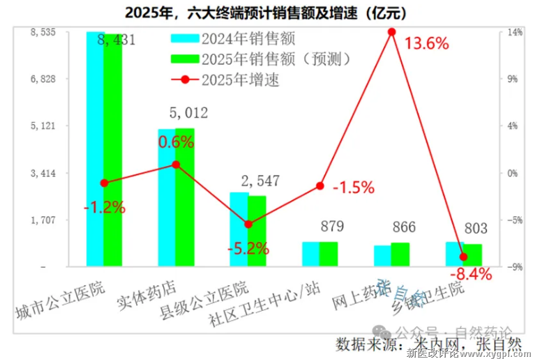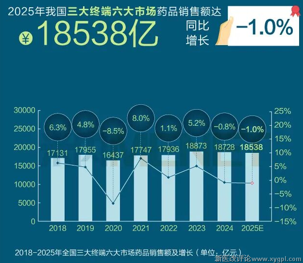 2025年,全国六大营销终端(不含民营医院、私人诊所、村卫生室)预计实现销售18538亿元,较2024年的18,728亿元减少190亿元,同比下降1%,这是历史上第三次下降