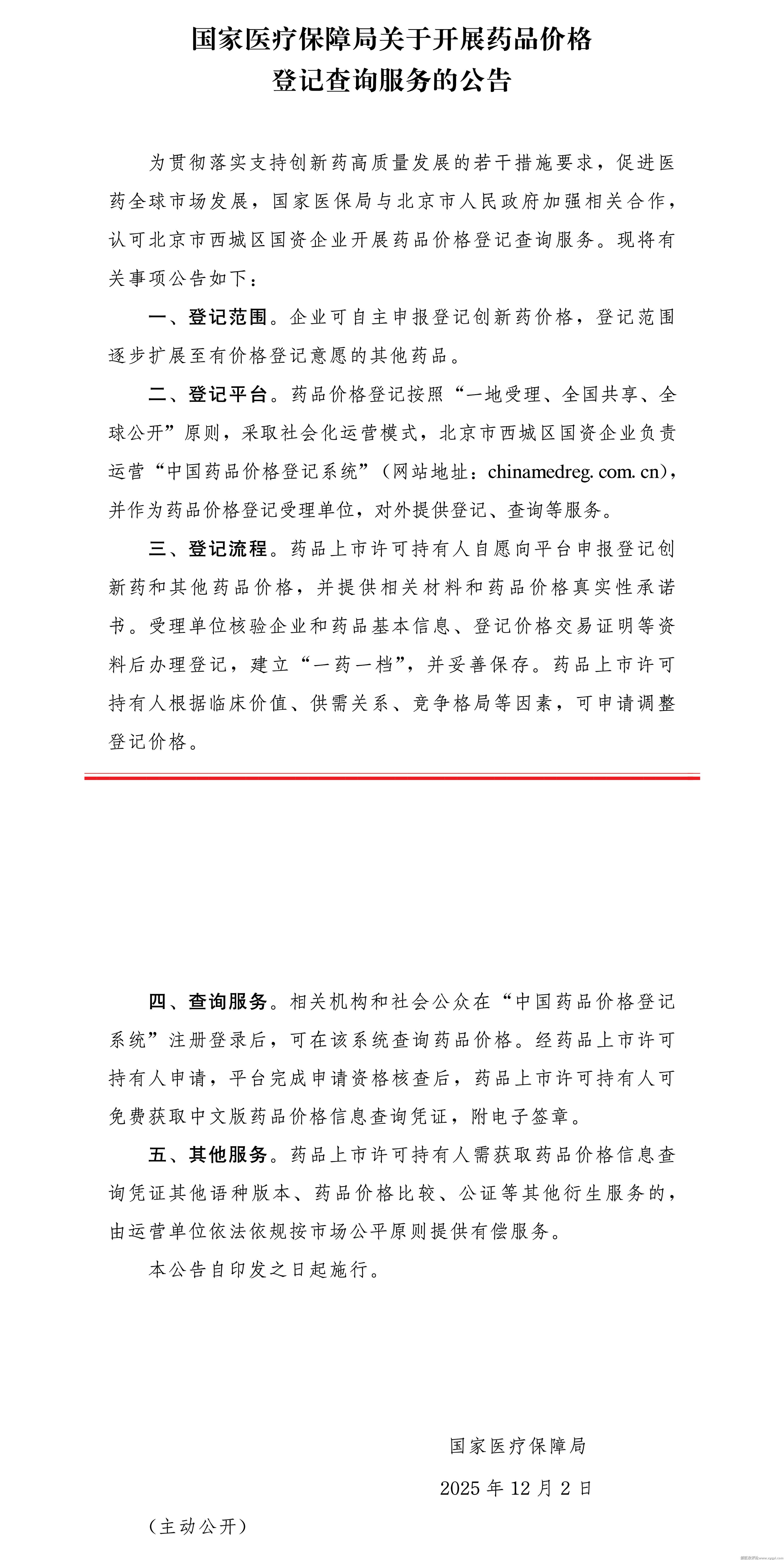 国家医疗保障局关于开展药品价格登记查询服务的公告