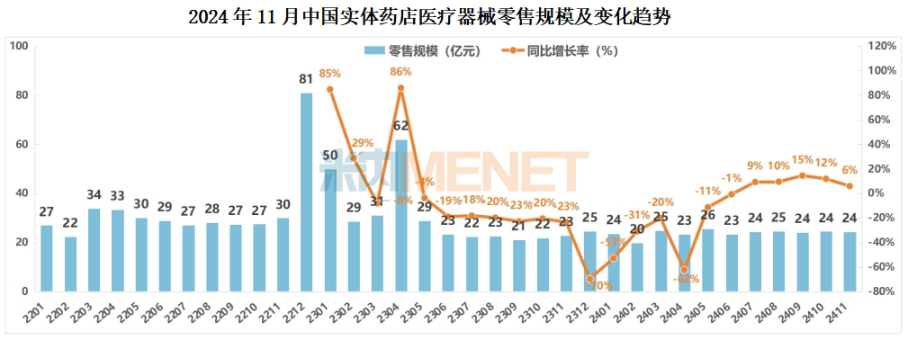 2024年11月全国实体药店医疗器械零售规模仍为24亿元,市场进入恒定期,与2023年同期相比,也仅有个位数的涨幅。
