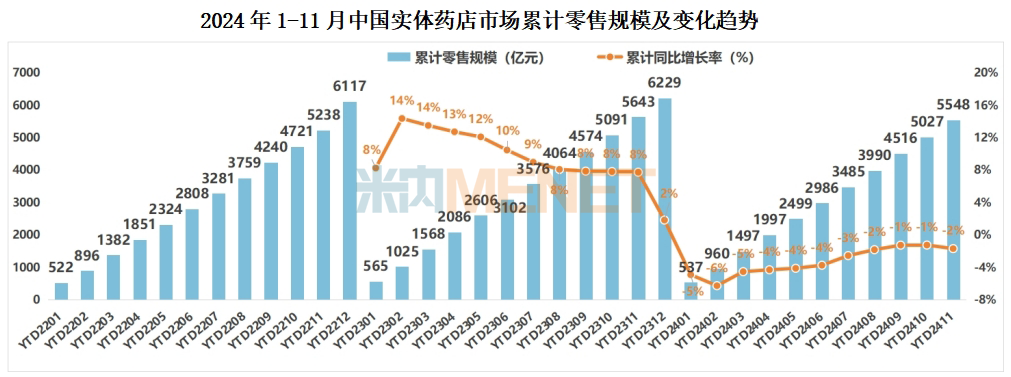 2024年1-11月中国实体药店的累计规模为5548亿元,较2023年同期累计规模下滑了1.7%。