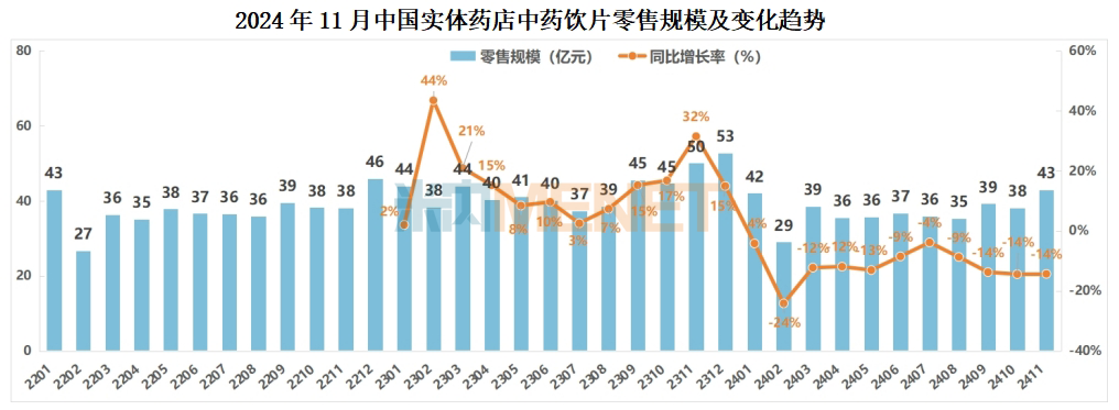 2024年11月全国实体药店中药饮片零售规模为43亿元,较10月规模增长12.3%,但与2023年同期相比,还是有明显差距。