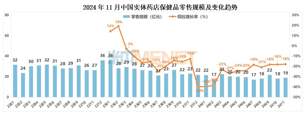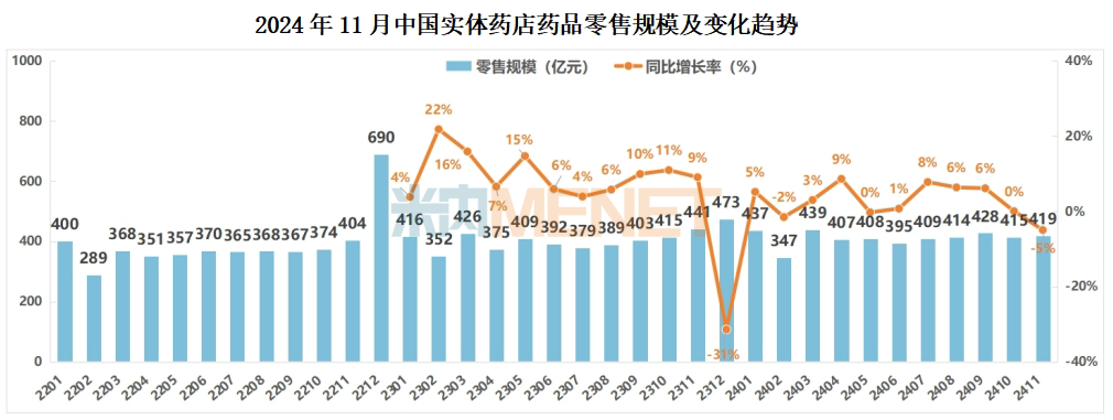 2024年11月,中国实体药店药品零售规模为419亿元,较10月略增4万元,与2023年同期相比,有5%的下降,药品零售市场增长无力。