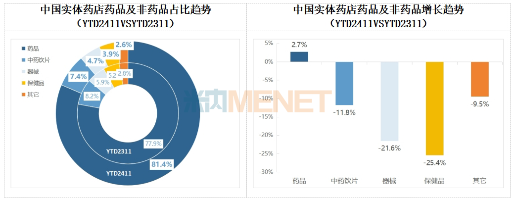 从2024年1-11月销售额累计增长率来看,药品的增长率缩小至2.7%,其它类别的产品均有不同程度下滑。