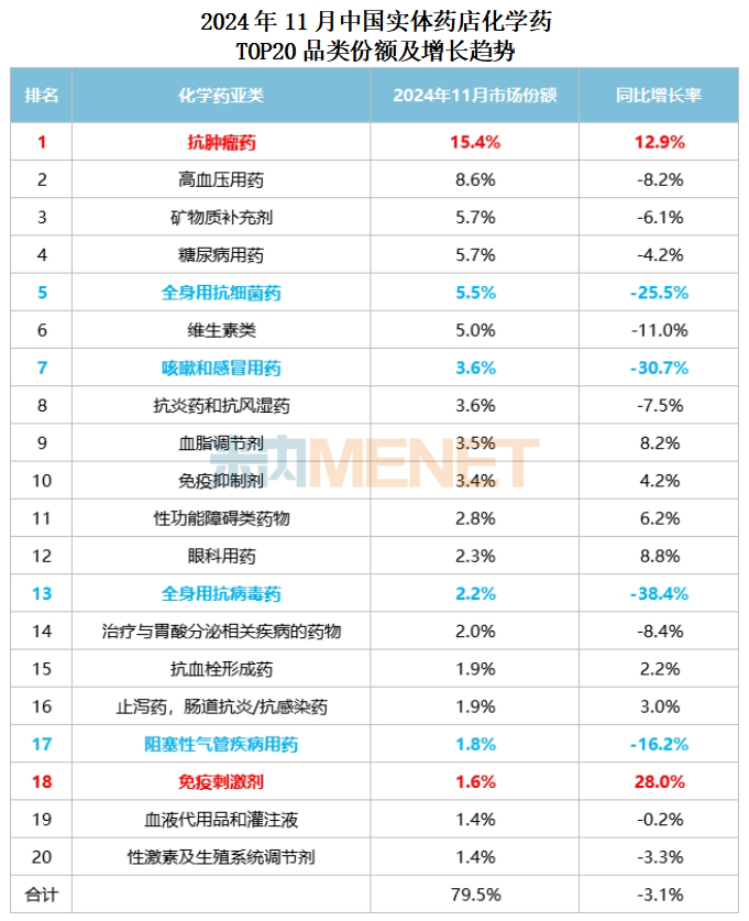 中化药TOP20品类分析:转入冬季,24年11月呼吸道疾病用药需求上升,但难敌23年同期
