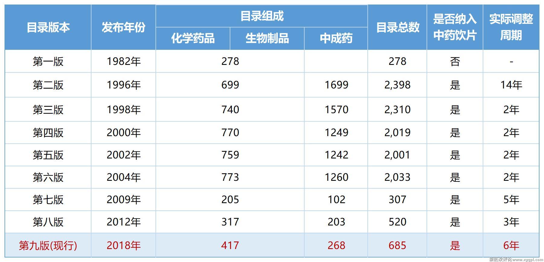 我国从1982年到2018年前后一共发布了九版基药目录,现行的是2018版基药目录。九版目录从1982年仅包含西药,到2018年西药、中成药和中药饮片均有涉及,药品范围不断扩大。