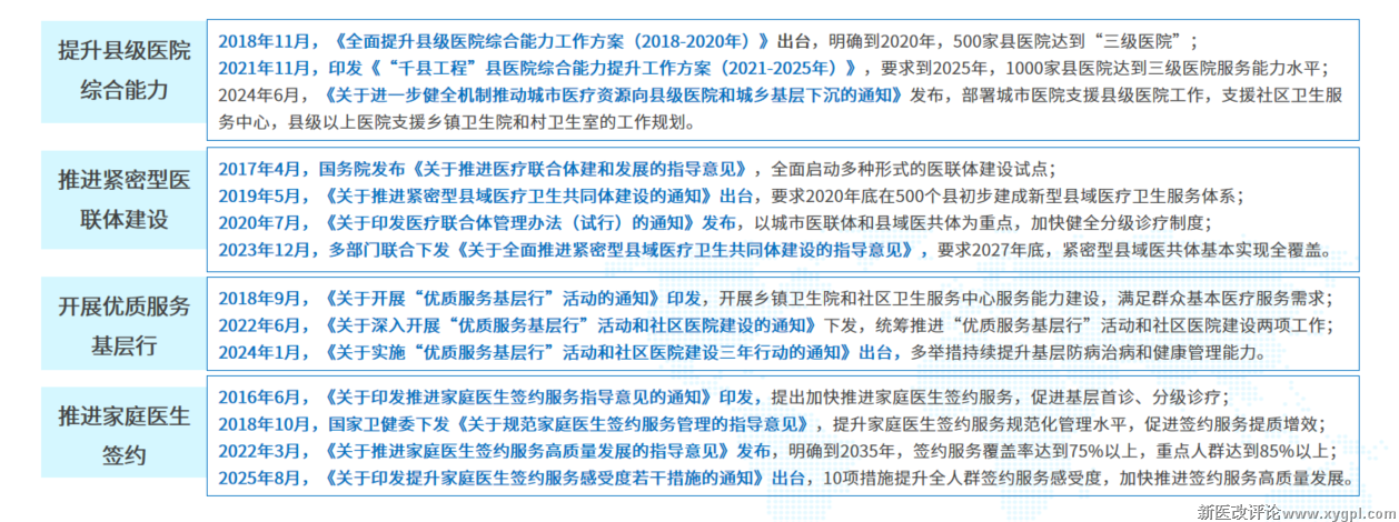 2025年9月,国务院批复并发布《医疗卫生强基工程实施方案》,要求坚持以基层为重点,着力强基层、固基础、保基本,织牢基层网底,进一步推动分级诊疗体系建设取得显著成效。政策提示基层医疗卫生服务在医改工作中的重要地位,并明确各基层医疗卫生机构功能定位。