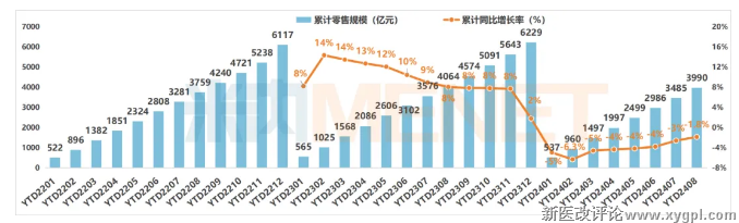 2025年1-8月中国实体药店市场累计零售规模及变化