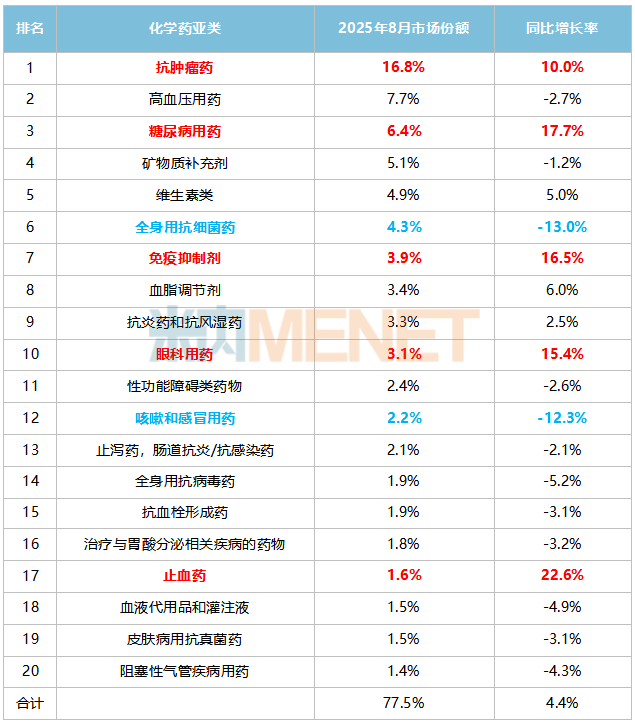 2025年8月中国实体药店化学药TOP20品类份额及增长趋势
