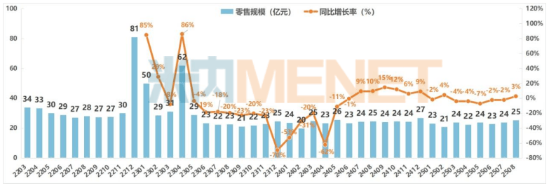 2025年8月全国实体药店医疗器械零售规模为25亿元,较7月增加了6.4%,且与去年同期相比,增长了2.6%,实现了同环比双增长的势头。