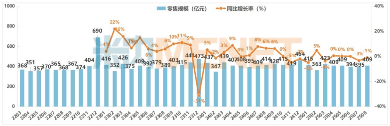 2025年8月中国实体药店市场零售规模及变化趋势
