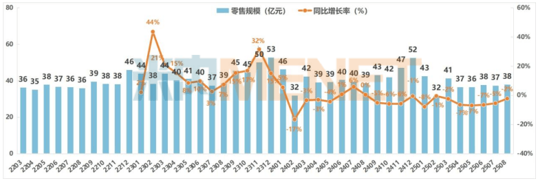 2025年8月中国实体药店保健品零售规模及变化趋势