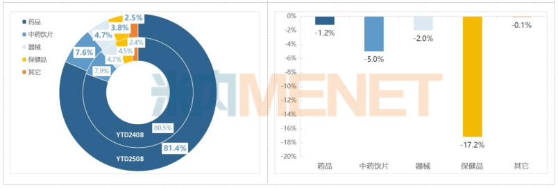 2025年前8月,药品占药店销售的81.4%,较2024年同期提升0.8个百分点,器械的份额与往期持平,中药饮片和保健品的份额则分别降了0.2和0.7个百分点。