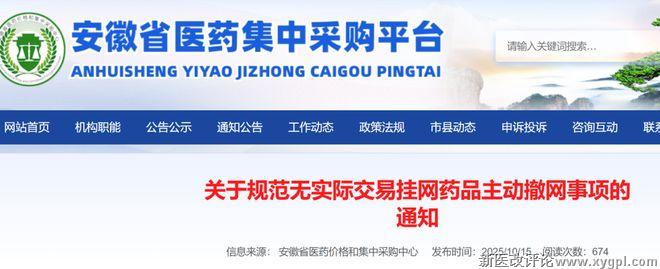 根据《安徽省医药集中采购平台药品挂网采购规则》(皖医保发〔2025〕10号)要求,为规范、有序开展药品撤网工作,现就规范企业无实际交易挂网药品主动撤网行为通知如下: