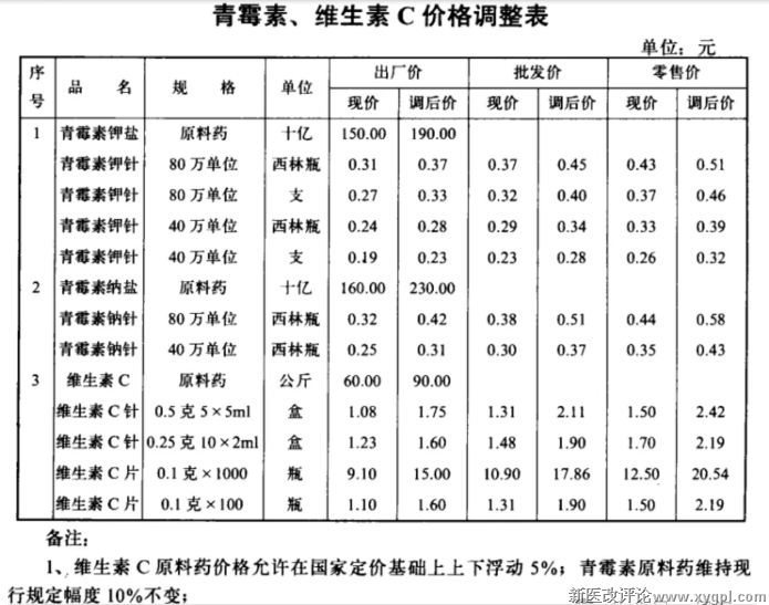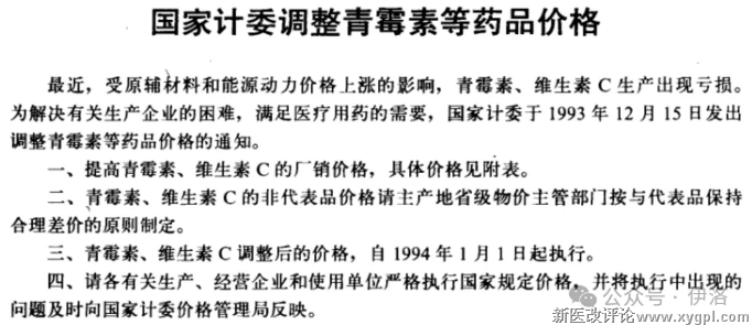 1993年底,受原辅材料和能源动力价格上涨的影响,青霉素、维生素 C 生产出现亏损。为解决有关生产企业的困难,满足医疗用药的需要,国家计委于 1993 年 12 月 15 日发出调整青霉素等药品价格的通知。