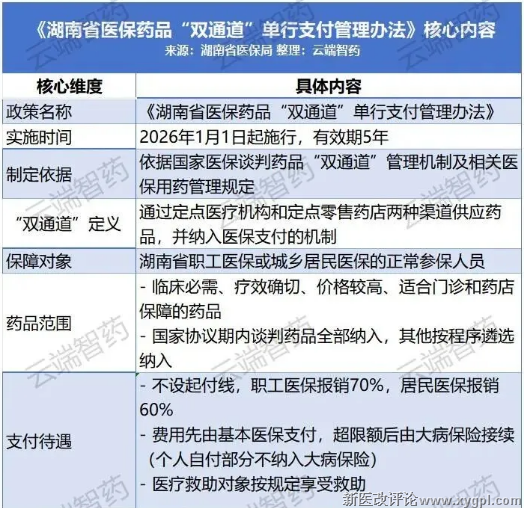 11月26日,湖南省医保局发出《湖南省医保药品“双通道”单行支付管理办法》的通知,该办法明确了湖南双通道单行支付管理办法。