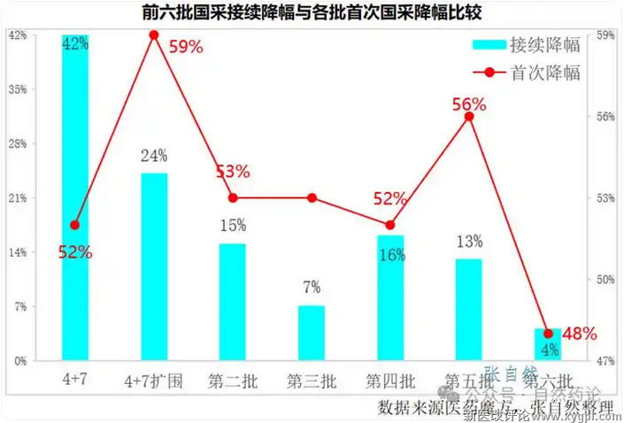前六批国采接续,降幅从4%到42%不等,平均降幅17%,即在前六批首次国采平均降幅53%的基础上,只降了17%。