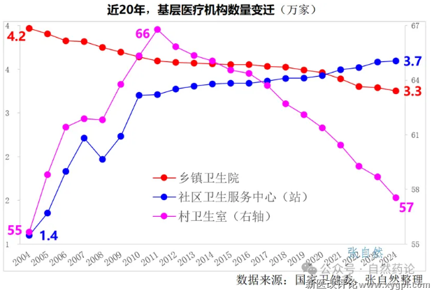 现对农村的乡镇卫生院、村卫生室和城市的社区卫生服务中心(站)的数量变化做一对比分析,其他分析请看文末国家卫健委的权威解读。