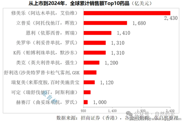 从上市开始到2024年,全球累计销售额Top10药品中,最小的也超过了1000亿美元,相当于我国2024年全年药品市场规模的近4成。