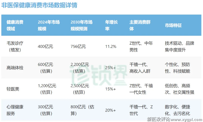 随着健康消费升级非医保逐步成为刚需。麦肯锡《未来健康 2025》报告指出,千禧一代与 Z 世代已将健康消费深度融入日常生活,毛发诊疗、轻医美、高端体检等非医保细分领域需求持续爆发,市场规模迎来快速增长期: