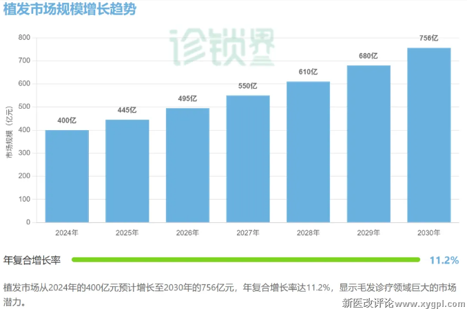 ⭐植发领域表现亮眼,2024 年中国植发市场规模已达400亿元,行业增长势能强劲,预计 2030 年市场规模将突破 756 亿元: