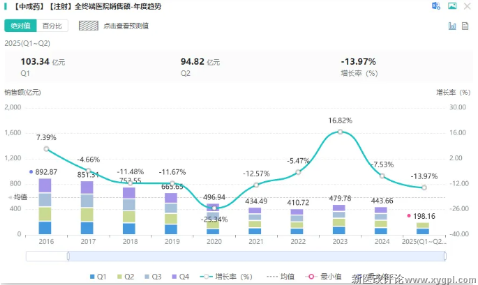 在医保控费、辅助用药目录、修订说明书等政策压力下,中药注射剂市场空间已被大幅压缩。摩熵医药数据显示,中药注射剂全国医院全终端市场规模呈现断崖式下跌,从2016年的892.87亿元缩水至2024年的443.66亿元,市场规模已缩减50%。这一下滑趋势在2025年仍在持续,上半年销售额继续下降13.97%。
