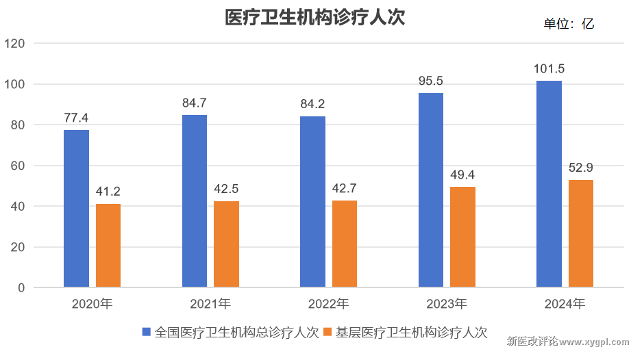 · 2024年,我国全国医疗卫生机构总诊疗人次101.5亿,其中基层医疗卫生机构诊疗人次52.9亿,占比52.12%;