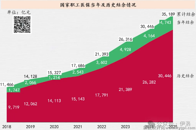 2025年职工医保统筹部分当期结存4743亿元,累计结余预估也达到了3.5万亿的高位;居民医保累计结余预估在8700亿出头;再加上职工个人账户1.5万亿结余,医保各账户已累计近6万亿人民币的巨额结余。