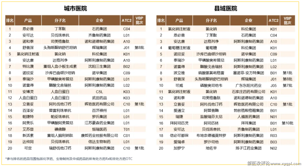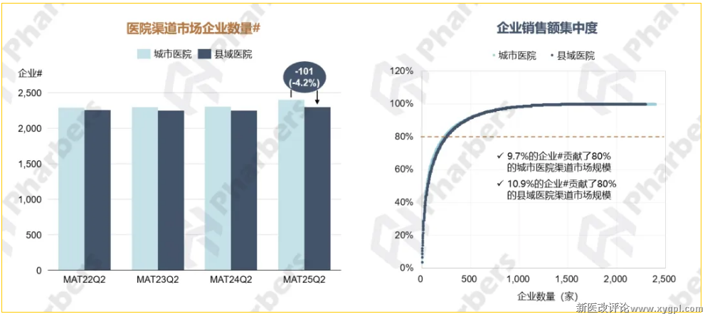 企业方面,根据法伯院内渠道数据显示,县域医院渠道参与药品销售的企业数量低于城市医院渠道,两类终端的企业销售额集中度相近(图5)。关注在两类医院终端排名靠前的企业,法伯数据显示,MAT25Q2共有16家企业同时在城市和县域医院渠道排名前20位,包括阿斯利康、恒瑞医药、齐鲁制药、辉瑞、诺华等,而罗氏集团、华润双鹤等企业则仅在单一医院渠道排名较高。