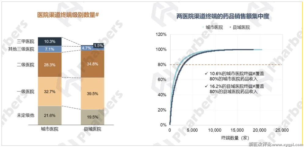 此外,根据法伯终端数据库显示,城市医院渠道的三级医院数量占比为17.4%,而县域医院渠道仅为6.2%。从终端药品销售额集中度来看,16.2%的县域医院终端数量覆盖80%的县域医院药品收入,集中度低于城市医院渠道(图4)。