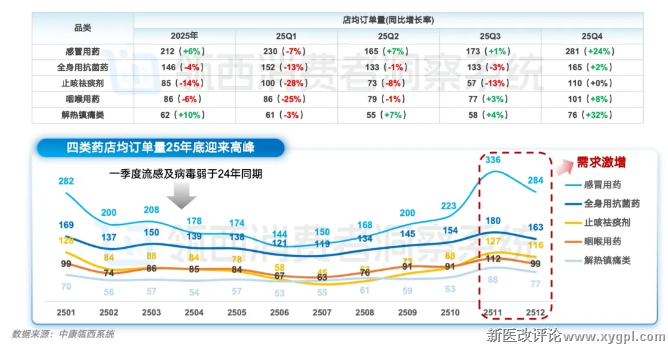 呼吸系统品类:因2025年第四季度流感爆发,驱动了呼吸系统品类如感冒用药、解热镇痛类店均订单量同比激增20%以上,凸显药店 “急救站”引流价值,构建 “流感监测+敏捷备货” 闭环,保障应急供给。