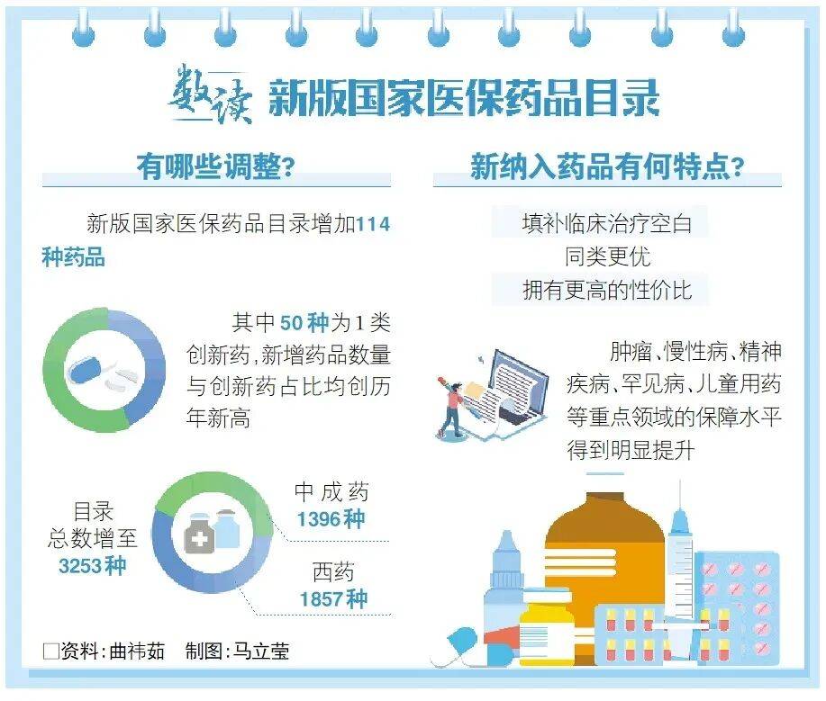 新版国家医保药品目录是国家医保局成立以来的第8次调整,新增114种药品,其中50种为1类创新药,新增药品数量与创新药占比均创历年新高, 新纳入药品呈现三个显著特点:填补临床治疗空白,同类更优,或是拥有更高的性价比。肿瘤、慢性病、精神疾病、罕见病、儿童用药等重点领域的保障水平得到明显提升。