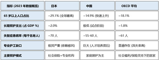 中国: 随着人口基数和寿命增加,中国拥有全球规模最大的失智症群体。报告提示,中国在失智症的 早期诊断和规范化基层护理 上与日本和 OECD 平均水平仍有较大差距。