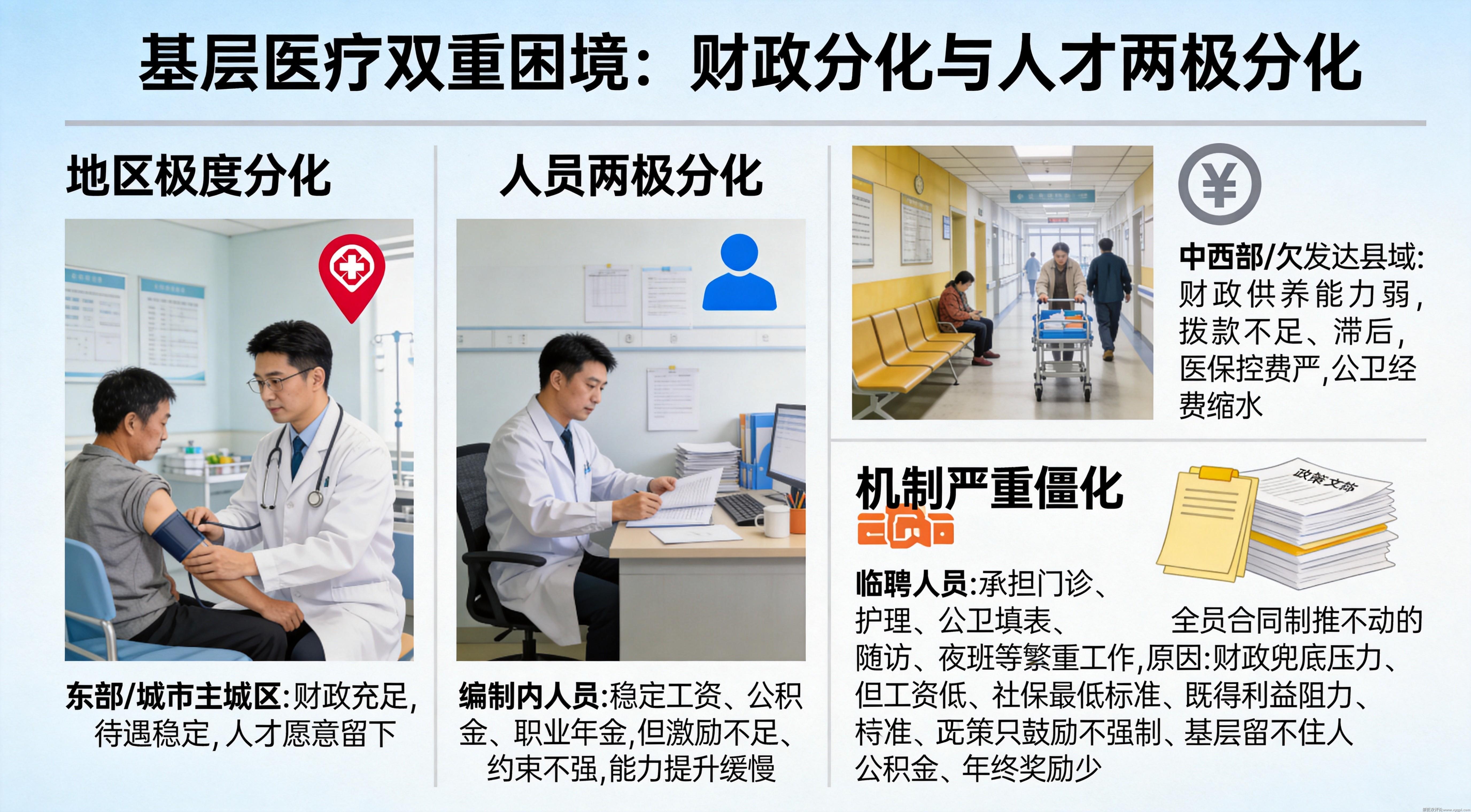 不少乡镇卫生院、社区卫生服务中心运转艰难,人员收入不稳,临聘人员同工不同酬、同工不统筹,正式编制人员动力不足,优秀人才留不住,部分地区甚至出现工资发放困难、机构勉强维持运转。