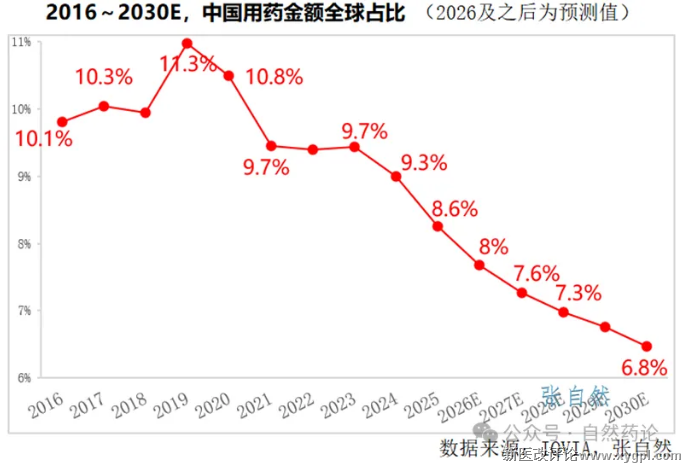2019年是分水岭,2019年我国用药金额在全球的占比达到历史峰值11.3%,2019年之前连年上升,之后逐年下降,到2025年已下降到8.6%。