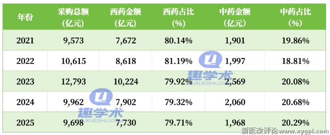 中成药占比差不多在2成左右,但是采购整体金额呈增加之势。趣学术搜集了2021年-2025年的采购数据,并分析了其中占比情况,从整体来看,西药采购金额占比这五年中平均占比为80.06%,中药为19.94%,西药占在2022年达到顶峰后,已经连续三年低于平均占比。