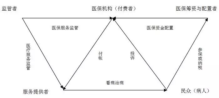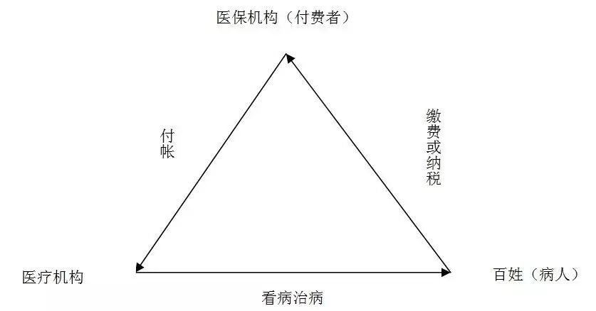 很 多人认为医疗体制颇为复杂,谈论起其改革更感到头大。其实,医疗体制的要害无非是图1所展示的三角关系。三角形的底边体现了百姓与医疗机构的关系,即看病 治病。所有国家的医疗体系都有这一边,但仅仅有这一边的医疗体系必定陈旧而运转不灵。众所周知,病来如山倒,医药费用的风险究竟多大、何时临头,对于任何 一个个体来说,都不可预知。况且,医疗服务需求者(病人)与提供者(医疗机构)之间信息严重不对称,需方吃什么药、动何种手术,基本上必须听命于供方。因 此,倘若供方不受到某种制约,其行事方式难免有悖于需方的利益,最典型的表现形式就是所谓“供方诱导的过度消费”,在中国体现为多开药、开贵药、多检查, 简称“过度医疗”。