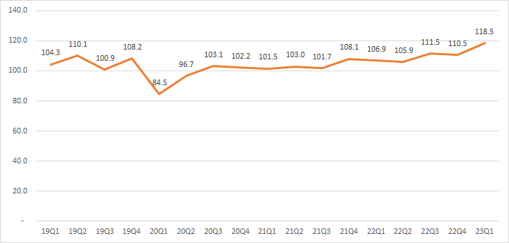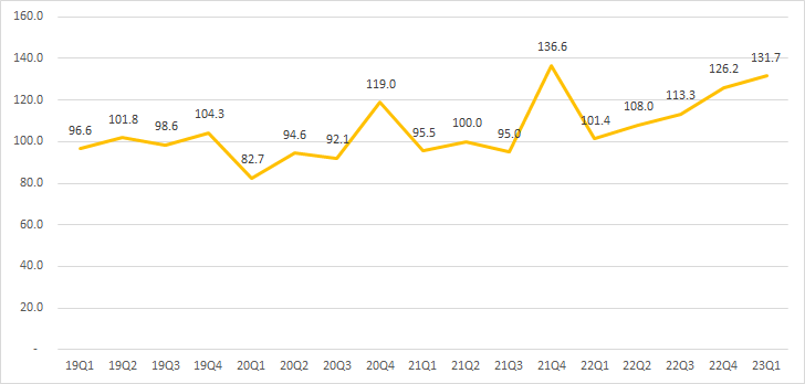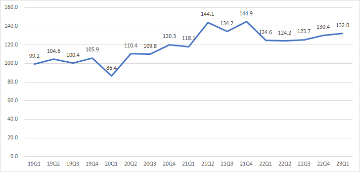自2022年以来,医药工业发展指数较为稳定,发展趋势良好,2022年医药工业指数整体稳定上升,2022年Q4指数上升至130.42。2023年Q1四大子行业除化学原料药外,指数环比均有所上升,与2022年Q1对比,同比景气度也有所上升,自2022年底结束新冠影响后,医院恢复至常态化,2023年Q1医药工业发展指数进一步上升至132.05。