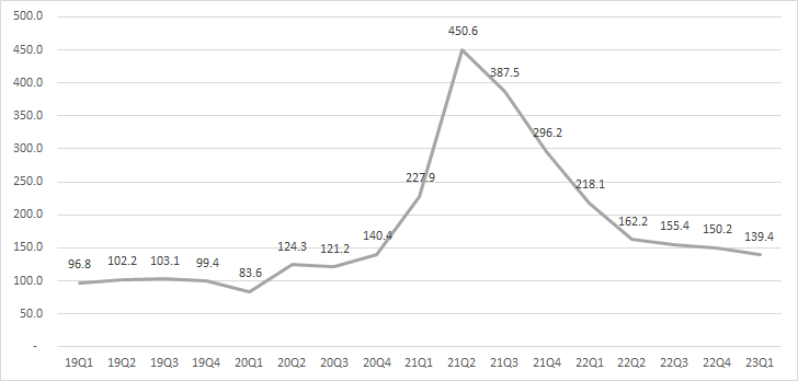 生物制品:生物制品指数是受到疫情影响最大的行业,自2022年Q4开始,新冠疫苗成为影响生物制品最大的因素,随着新冠疫苗接种人数迅速攀升,生物制品指数也急剧飞升,生物制品指数在2021年Q2达到450.58的峰值,但随着新冠疫苗接种人数逐渐饱和,生物制品指数也逐步回落值常态,目前影响生物制品的主要因素已经不再包括新冠疫苗,血制品、非新冠疫苗及生物药是影响生物制品行业的主要领域。2023年Q1生物制品指为139.40,近几个季度均处于下降趋势。