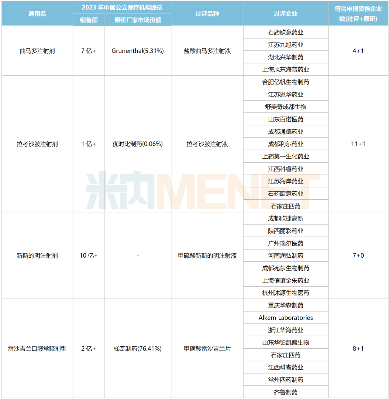 从竞争情况看,拉考沙胺注射剂、伏硫西汀口服常释剂型、普瑞巴林口服液体剂、美金刚口服液体剂4个品种竞争激烈,符合申报资格企业数达10家及以上;曲马多注射剂、氟伏沙明口服常释剂型、奥卡西平口服常释剂型等10个品种竞争格局良好,目前符合申报资格企业数达5家。