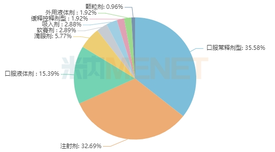 从剂型分布看,以片剂、胶囊剂为代表的口服常释剂型最多,占比超过35%;注射剂紧接其后,占比接近33%;口服液体剂排位第三,占比超过15%。米内网数据显示,2023年中国公立医疗机构终端注射剂(化学药)、口服溶液剂(化学药)销售额分别超过4400亿元、240亿元。