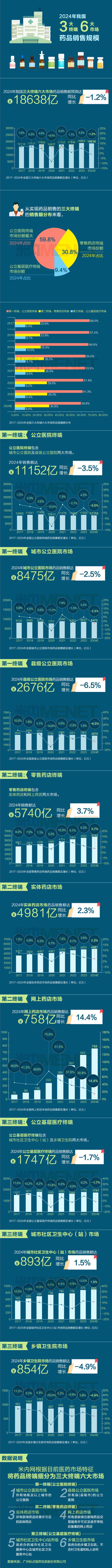 2024年是我国医药行业经历疫情冲击后回归理性发展的重要一年。米内独家预测,2024年中国三大终端六大市场药品销售额达18638亿元,与2023年相比下滑了1.2%。这一数据反映出药品市场受医保控费、集采、强监管等政策因素,以及宏观经济环境等多重因素的影响下,销售额出现小幅下降的情况。