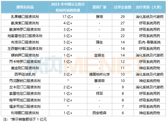 16个通用名药品2023年在中国公立医疗机构终端的销售额合计超过58亿元。其中,乳果糖口服液体剂销售额超过17亿元,羧甲司坦口服液体剂销售额超过7亿元,布洛芬口服液体剂销售额接近6亿元,氨溴索口服液体剂销售额超过4亿元。
