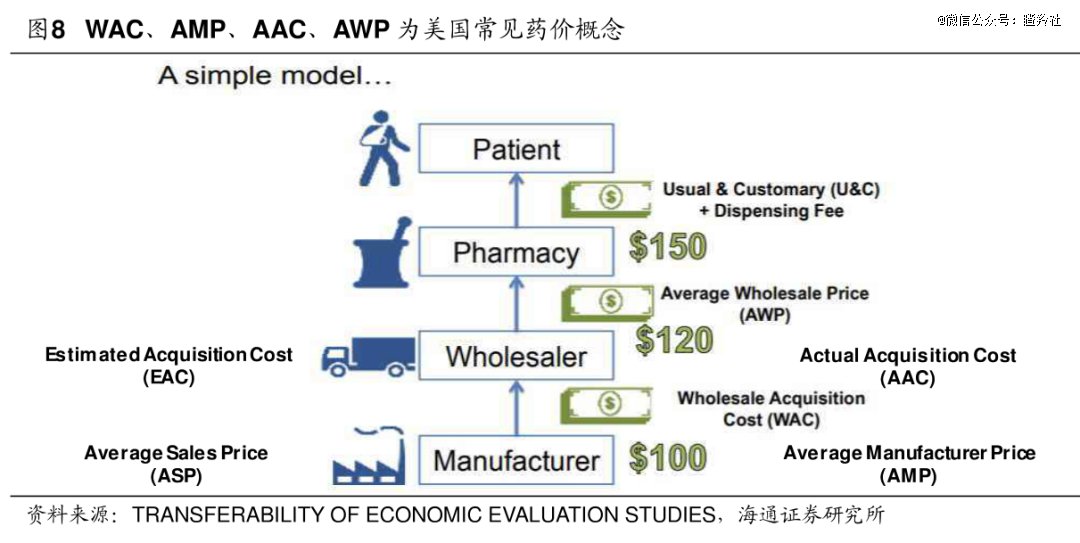 首先需要明确的是几个重要的概念,一是常用和惯用价格(U&C),U&C可以理解为自费价格(即没有投保的消费者步入零售药房所支付的药品零售价,又被称为“现金价格”);二是批发收购成本(WAC),一般指批发商支付药企制造商的价格(但其中包含可能的折扣,是批发商和药企谈判的起点价格);三是平均销售价格(ASP),包括所有折扣的平均价格(比WAC更接近真实药价,但不被公开)。