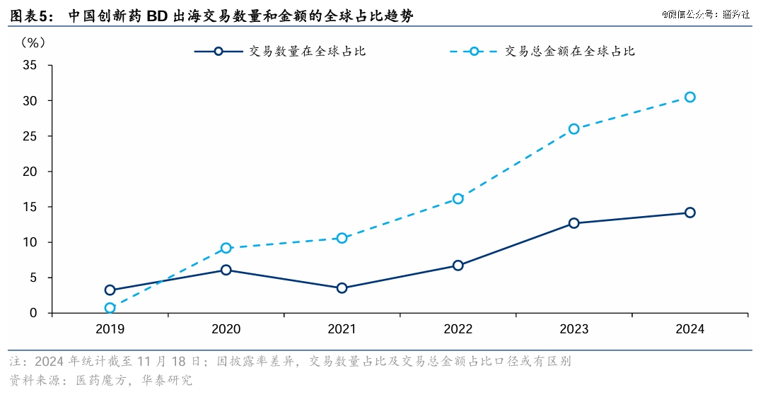 2)中国分子性价比:华泰医药数据显示(截至2024年11月18日),国产创新药BD项目数量全球占比为14%,总金额占比为30%。