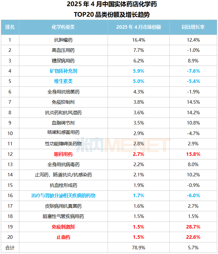 化学药TOP20品类中,仅有13个品类为正增长,其中月度同比增速高于15%的品类有3个,分别是:免疫刺激剂、止血药和眼科用药。而同比负增长超过5%的有3个类别:矿物质补充剂、治疗与胃酸分泌相关疾病的药物和维生素。