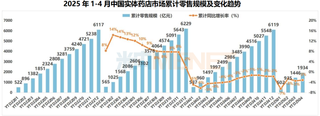 2025年1-4月中国实体药店的累计规模为1934亿元,较去年同期累计规模下滑了3.1%。医保控费、线上分流等多重压力下,实体药店市场负重前行,传统经营模式与消费需求、新兴渠道的适配矛盾持续凸显。