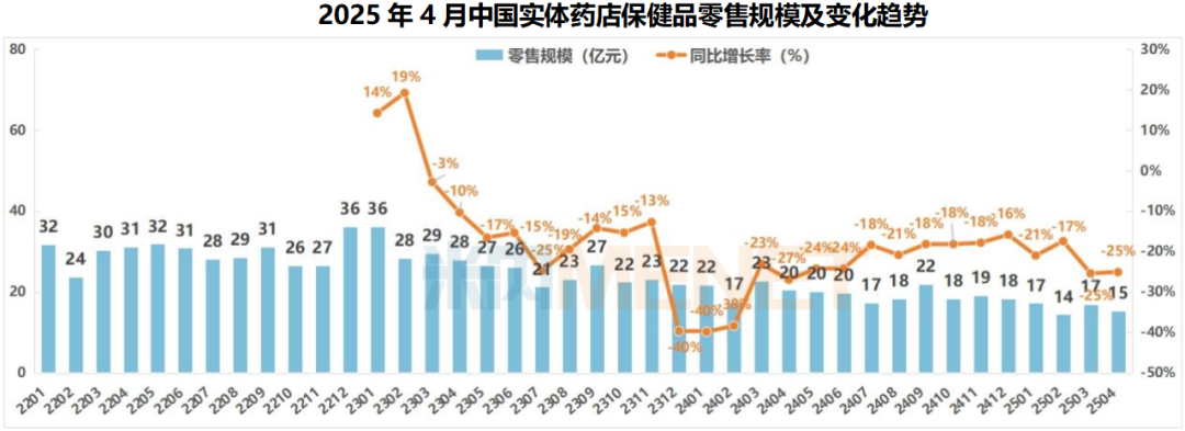 2025年4月全国实体药店保健品零售规模为15亿元,规模较上月减少2个亿,与去年同期相比,保健品市场仍有较大程度的萎缩。