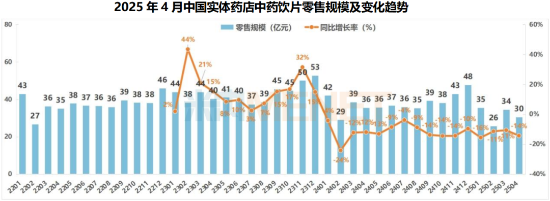 2025年4月全国实体药店中药饮片零售规模为30亿元,较3月规模减少了4亿元,低于同期6亿元。中药饮片的规模为最近三年同期最低点。