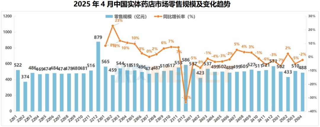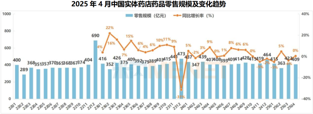 2025年4月,中国实体药店药品零售规模为409亿元,销售较3月有所回落,减少了14亿元,与去年同期规模基本持平,药品的增长也呈现乏力之势。
