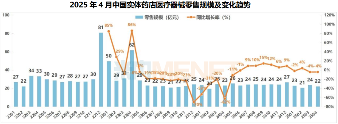 2025年4月全国实体药店医疗器械零售规模为22亿元,较3月减少2亿元,与去年同期相比,略减少1亿元的规模,医疗器械类别发展相对恒稳。
